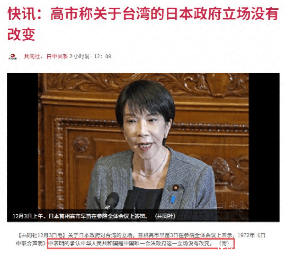 在国际舞台上,地缘政治的角力持续上演,而最近的中日关系紧张无疑是这一剧本中的一幕重要戏码。随着中国对日本的强势施压,终于在12月3日迎来了一个重要时刻。日本首相高市早苗在国会上承认了1972年《日中联合声明》中关于中国是代表中国的唯一合法政府这一立场没有改变。这句话看似平淡,却满载着复杂的历史背景和当下的国际局势。
