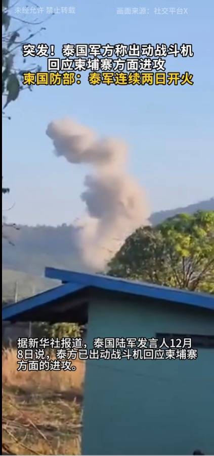 据新华社12月8日消息:泰国军方8日表示,泰方出动战斗机回应柬埔寨方面的进攻,此前双方使用轻武器相互射击。柬埔寨国防部发言人当天表示,泰国士兵连续第二天向柬埔寨武装部队开火,但柬埔寨方面并未还击。柬埔寨参议院主席洪森同日要求边境一线部队保持克制。