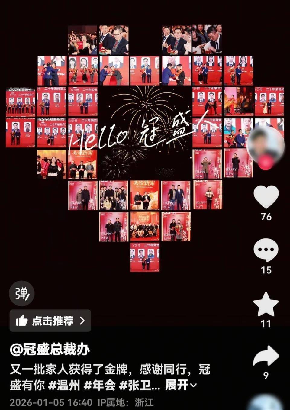 记者在短视频网站搜索发现,名为“冠盛总裁办”的账号在1月5日发布了给工龄20年的员工发放纯金奖牌的视频,员工一一上台领取,并收到一束鲜花,背后的显示屏上是他们的照片和姓名及对应的部门。该公司另有一名工作人员告诉记者,2025年该公司的年会曾邀请艺人汪东城演出,今/p>