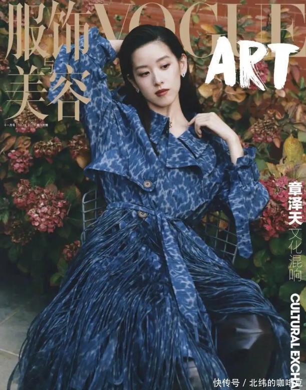 如今又有了新身份,才发现她的“野心”不止于此。 杂志封面上的她,穿着一件深蓝色的长款衣服,下半部分像是流苏一样的质感,一条一条的。 她的姿势也很放松,一只手搭在头上,但表情却跟之前的那个她不太一样。