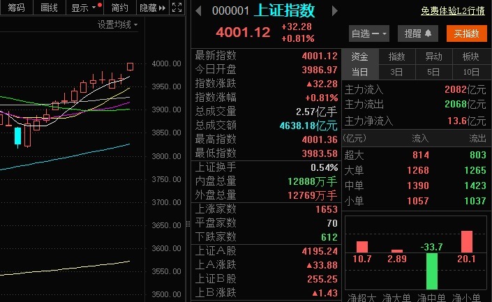 【大河财立方消息】2026年A股首个交易日盘中,沪指拉升涨近0.8%,时隔34个交易日,上证指数盘中重回4000点。